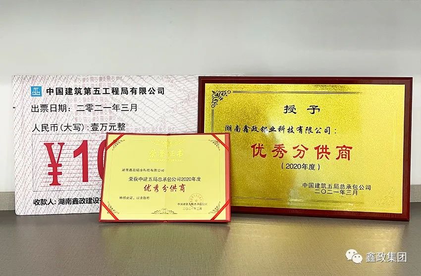 瀏覽次數:1517喜訊連連捷報傳。近日,在中建五局總承包公司2021年分包(供)商答謝會暨優秀分包(供)商表彰會上,集團下屬子公司湖南鑫政鋁業科技有限公司與湖南鑫政建設有限公司分別喜獲2020年度“優秀分供商”與“良好分包商”獎項。