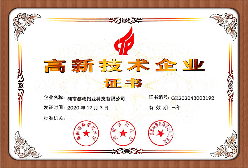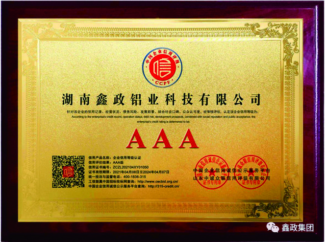 瀏覽次數:1552近日,鑫政集團子公司鑫政鋁業喜報頻傳,再獲殊榮。根據湖南省2020年高新技術企業認定規定,經專家評審、權威公示等程序,鑫政鋁業憑借產品研發、科研人才培養、質量把控等方面的出色表現,榮獲“高新技術企業”榮譽稱號。同時,經過中國企業信用誠信公示服務平臺的嚴格審核,該公司榮獲“AAA級企業信用等級”證書。