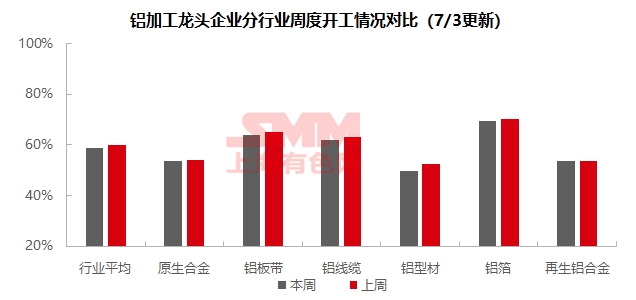 【SMM鋁下游周度調(diào)研:高溫淡季疊加需求疲軟 鋁加工開工率小幅下滑至58.7% 】高溫淡季、鋁價高企、利潤空間不足、下游需求疲軟等因素影響下,本周鋁加工行業(yè)開工環(huán)比上周下降0.1個百分點至58.7%.